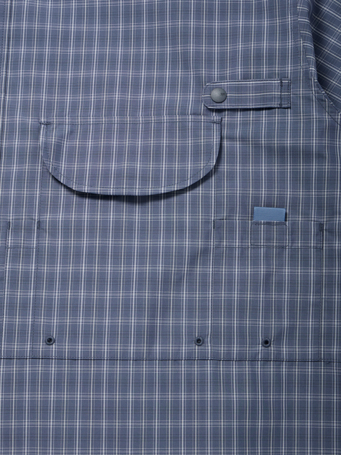 清涼感のあるオリジナル柄のチェックのシャツ地を使用して作成したコレクション。1980年台にデザインされたマルチポケット付きフィッシングシャツをデザインベースにアレンジしたショートスリーブシャツ。フロントに配した、複数のマルチポケットは、カード、携帯電話、ペン、パスポートなど、様々な用途に対応できるようデザイン。ミニロッドを収納するホルダーも加え、フィッシング用途にも機能できるデザイン。